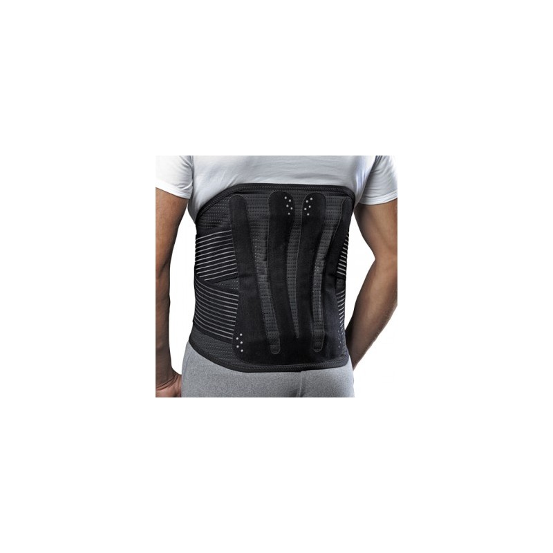 Corsetto lombosacrale di 35 cm di altezza, con doppia chiusura a strappo, quattro stecche posteriori modellabili e incrocio posteriore di rinforzo.