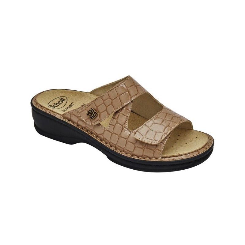 Nevia è una ciabatta con soletta removibile e con tecnologia Bioprint®. La tomaia è caratterizzata da chiusure con velcro per offrire un'ottimale aggiustabilità. Il plantare in sughero e gomma permette al piede di tenere una corretta posizione. La tecnologia Scholl Removable Insole sostiene l'arco longitudinale del piede ed evita movimenti dolorosi per il piede.